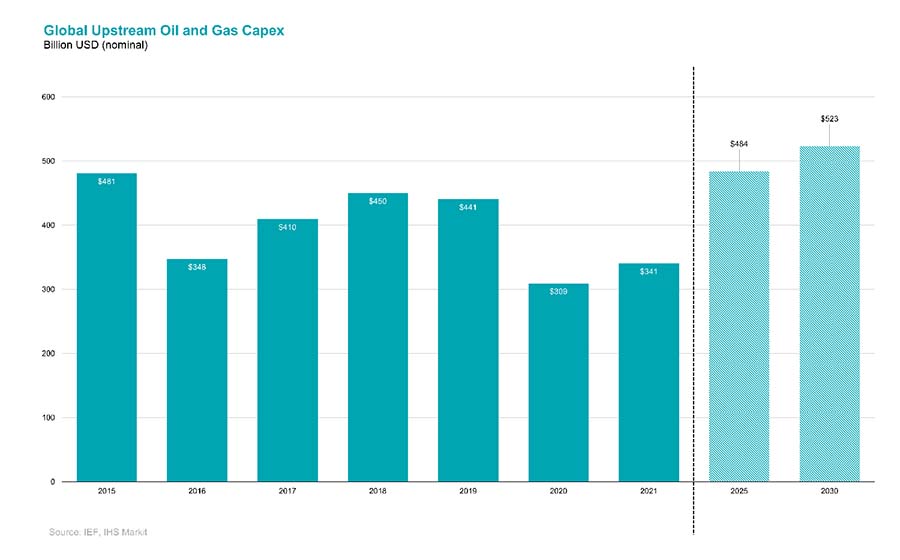 - Oil and gas upstream investment will need to increase and be sustained at near pre-COVID levels of $525 billion through 2030 to ensure market balance despite slowing demand growth. Upstream investment in the oil and gas sector in 2021 was depressed for a second consecutive year at $341 billion – nearly 25% below 2019 levels. Meanwhile, oil and gas demand is now near pre-pandemic highs and will continue to rise for the next several years, particularly in developing countries.